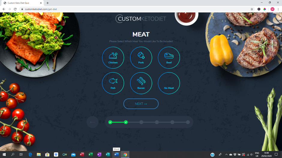 The Next Question is where it starts to get interesting, It asks you which of the following you would like to include in your keto diet, Chicken, Pork, Beef, fish, Bacon, or no meat at all? you can select as many as you like or none at all. then click next.