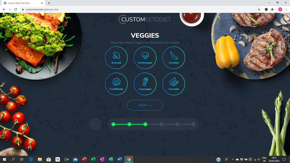 The Next question simply asks you which of the following veggies you would like to include in the keto diet plan, Broccoli, Mushrooms, Zucchini, Cauliflower, Asparagus and Avocado?